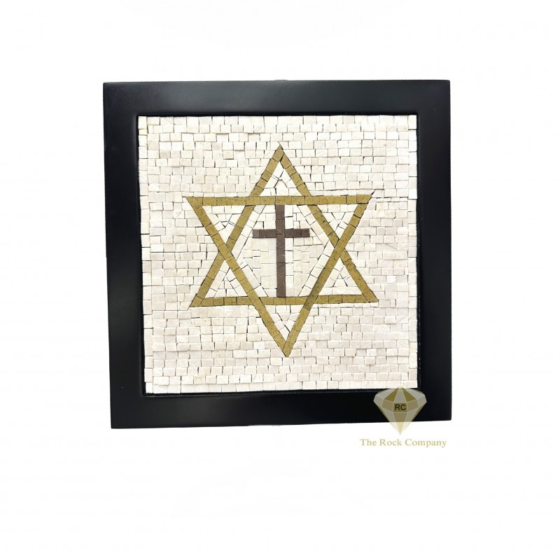 This unique mosaic design features the Star of David with a Cross at its center, beautifully symbolizing the spiritual connection between the Old and New Testaments. The Star of David represents Jewish heritage and biblical tradition, while the Cross reflects the foundation of Christian faith. Together, they express unity, fulfillment of prophecy, and the shared roots of faith.
